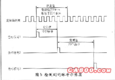 實際印刷位置的檢測是通過光電掃描器把檢測到的色標信號轉(zhuǎn)化為電脈沖,這些電脈沖與旋轉(zhuǎn)編碼器產(chǎn)生的脈沖串同時被送到套印系統(tǒng)計算機。各色組色標之間的距離給定值為20mm,即兩顏色套準時,兩色標之間的距離是20mm,對應(yīng)于編碼器脈沖數(shù)為20個脈沖。如圖5所示,色標1與色標2兩脈沖觸發(fā)時間段中計數(shù)為18個脈沖,如以印色1為基準,則說明印色2的印版軸轉(zhuǎn)速太快,為使其速度減慢,糾正位置偏差,應(yīng)使伺服電機反轉(zhuǎn)相當于2個脈沖的角度;假設(shè)色標2與色標3兩脈沖觸發(fā)時間段脈沖數(shù)為23個脈沖,以印色2為基準,則說明印色3的印版軸轉(zhuǎn)速太慢,為使其速度加快,糾正位置偏差,應(yīng)使伺服電機正轉(zhuǎn)相當于3個脈沖的角度以消除偏差。
