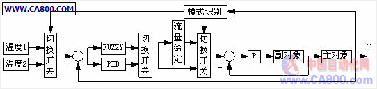 變結(jié)構(gòu)調(diào)節(jié)器控制系統(tǒng)如圖1所示。在圖1中加熱爐是主要調(diào)節(jié)對象,具有大慣性、非線性的特點。主調(diào)節(jié)器由模糊控制和PID控制組成。而副對象是調(diào)節(jié)閥,其時間常數(shù)往往很小,以防止出現(xiàn)大的超調(diào)和波動。副調(diào)節(jié)器為P調(diào)節(jié)器。