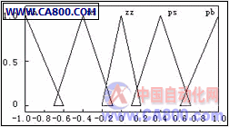 2.2.1 模糊控制器的結(jié)構(gòu) 選擇模糊控制器的輸入變量為誤差e及誤差的變化ec,輸出變量u為控制量的變化量,相應(yīng)的模糊集為E,EC,U,是一個雙輸入單輸出的二維模糊控制器。對誤差E、誤差變化EC及控制量U的模糊集及其論域定義如下:E、EC和U的模糊集為:{NB,NS,ZZ,PS,PM,PB},PB,PS,ZZ,NS,NB分別對應(yīng)正大、正小、零、負小、負大;將誤差e,誤差變化率Δe和控制量u的模糊語言變量E,EC以及U的論域分成5個等級[2>。它們的隸屬函數(shù)選trimf(三角形),如圖2所示。