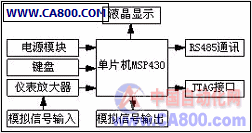 調(diào)節(jié)器的硬件構(gòu)成見圖3。工業(yè)現(xiàn)場標準的模擬信號可以直接經(jīng)過儀表放大器INA114放大進入MSP430模數(shù)轉(zhuǎn)換器的輸入端,采用MSP430本身提供的2.5V電壓作為該模數(shù)轉(zhuǎn)換器的參考電壓。作為實驗板,僅對外部兩路差分信號采樣,即4~20mA DC和0~10V DC信號。JTAG接口用來調(diào)試程序,因為MSP芯片采用的是表面封貼的封裝TQFP64,通過插座實現(xiàn)開發(fā)系統(tǒng)和目標板的連接不方便。RS485通訊用于組建小型控制網(wǎng)絡(luò)。模擬信號輸出采用2個8位D/A轉(zhuǎn)換器DAC0832,可分別輸出4~20mA和0~10V DC信號。為方便操作,設(shè)計了調(diào)整參數(shù)用的小鍵盤,只有3個鍵即增加、減小和確認鍵。設(shè)置的參數(shù)和調(diào)節(jié)曲線用低功耗液晶屏顯示。