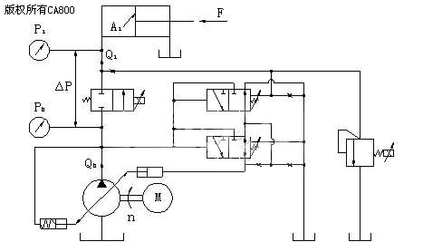 如圖一所示:A1:油缸無桿腔活塞面積 F:工作負載 Q1:工作流量 P1:工作壓力 △p:比例調(diào)速閥兩端的壓力差 Qy:比例溢流閥流量 Pb:油泵壓力,Qb:油泵流量 Vb:油泵排量 n:電動機轉(zhuǎn)速