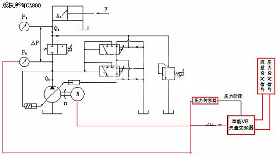 微能公司是將矢量變頻技術(shù)應(yīng)用于注塑機電機驅(qū)動上,通過速度調(diào)節(jié)及壓力PID閉環(huán)控制功能完成對注塑機的精確控制。油路上將比例調(diào)速閥人為硬性的將流量調(diào)至最大并保持或者拆除,同時切斷流量、壓力反饋閥對變量泵的活塞的控制。改為矢量變頻PID控制維持壓力的恒定,自動實現(xiàn)了壓力自適應(yīng)控制,這樣系統(tǒng)從源頭上消除油路中的節(jié)流及溢流能量損失,使注塑機獲得最佳的節(jié)能效果。系統(tǒng)如下所示: