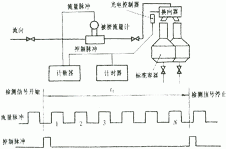 傳統(tǒng)的脈沖型流量傳感器儀表系數(shù)的檢定一般由容積式流量標(biāo)準(zhǔn)裝置和計(jì)數(shù)器、計(jì)時(shí)器完成,如圖1所示。其儀表系數(shù)定義為單位體積的流體量通過流量傳感器時(shí)傳感器所發(fā)出的脈沖數(shù),單位通常為1L(脈沖數(shù)每升)或1m3(脈沖數(shù)每立方米)。根據(jù)文獻(xiàn)[1>的規(guī)定,為了保證流量計(jì)儀表系數(shù)的有效性,一般應(yīng)保證一次檢定中流量計(jì)輸出的脈沖數(shù)的相對(duì)誤差絕對(duì)值不大于被檢流量計(jì)重復(fù)性的13。由于一般計(jì)數(shù)器的計(jì)數(shù)誤差為±1個(gè)脈沖,所以在檢定時(shí)間間隔(圖1中兩控制脈沖間的時(shí)間t)內(nèi),計(jì)數(shù)器應(yīng)收集足夠多的脈沖數(shù)N才能達(dá)到要求的檢定精度。