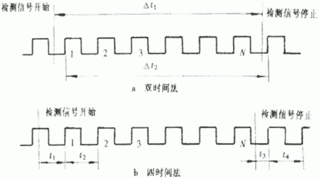 對(duì)于一些大口徑流量傳感器,由于其儀表系數(shù)一般較?。ㄈ?00的渦輪流量計(jì),其儀表系數(shù)僅為1.5/L; 口徑的渦街流量計(jì),其儀表系數(shù)更低,僅為約0.2/L)。對(duì)于這樣的流量計(jì),要收集足夠多的脈沖數(shù),一要花很長(zhǎng)的檢定時(shí)間,二要有較大的檢定設(shè)備(較大的標(biāo)準(zhǔn)容器)。由于種種限制,總使計(jì)數(shù)脈沖達(dá)不到要求。雙時(shí)間法計(jì)數(shù)技術(shù)是目前國(guó)際上較為通用的脈沖插值技術(shù),可以在較短的檢定時(shí)間內(nèi),用較小體積的檢定設(shè)備,在計(jì)數(shù)總脈沖數(shù)較小時(shí)仍能保證足夠的技術(shù)精度的一種脈沖插值技術(shù),較早應(yīng)用于微型體積管流量標(biāo)準(zhǔn)裝置。 我們研制的“脈沖型流量傳感器檢定儀”是用傳統(tǒng)的計(jì)數(shù)器加上雙時(shí)間法測(cè)量控制技術(shù)組成的雙時(shí)間法檢定儀。試驗(yàn)表明,該檢定儀使用方便可靠,可以縮短檢定時(shí)間,用較小的標(biāo)準(zhǔn)容器檢定較大口徑的流量傳感器,并且比常規(guī)檢定方法具有更高的技術(shù)精度。 1、雙時(shí)間法計(jì)數(shù)器原理 脈沖內(nèi)插技術(shù)是活塞校驗(yàn)裝置增加流量計(jì)的輸出信號(hào)分辨率,從而減小校驗(yàn)裝置體積的一個(gè)有效途徑。通常,校驗(yàn)流量計(jì)時(shí)為了得到足夠的脈沖數(shù),可以采取兩個(gè)途徑,一是提高流量計(jì)的輸出信號(hào)分辨率,使有限的校驗(yàn)時(shí)間內(nèi)得到盡可能多的脈沖數(shù);二是增加校驗(yàn)裝置的計(jì)量有效容積。一般,單位體積流體通過流量計(jì)所輸出的脈沖數(shù)是有限的(如上述的渦輪流量計(jì)和渦街流量計(jì)),校驗(yàn)裝置的計(jì)量有效容積也不可能做得很大。脈沖內(nèi)插技術(shù)很好地解決了這個(gè)問題,它有雙時(shí)間法、四時(shí)間法和鎖相環(huán)回路法等幾種方法可供使用。使活塞校驗(yàn)裝置用一個(gè)“小容積”(裝置有效容積)采集500個(gè)脈沖就能達(dá)到大容積校驗(yàn)裝置采集10000個(gè)脈沖相同的精確度。 雙時(shí)間法的原理如圖2a所示。在流量脈沖信號(hào)周期穩(wěn)定的條件下,脈沖內(nèi)插數(shù)為
