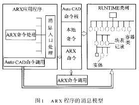 ObjectARX2000是Autodesk公司隨著AutoCAD2000推出的新一代的功能強(qiáng)大的二次開(kāi)發(fā)工具。它使用面向?qū)ο蟮模?+應(yīng)用程序開(kāi)發(fā)機(jī)制,以動(dòng)態(tài)鏈接的形式與AutoCAD共享地址空間,能夠直接利用AutoCAD的內(nèi)核代碼,訪問(wèn)AutoCAD的數(shù)據(jù)庫(kù)、圖形系統(tǒng)及幾何造型核心[3>,擴(kuò)充AutoCAD的類(lèi)和協(xié)議,創(chuàng)建新的AutoCAD命令,并可被AutoCAD環(huán)境直接調(diào)用,具有較高的程序開(kāi)發(fā)與執(zhí)行效率。ARX程序命令的消息模型如圖1所示。
