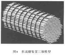 二維圖形不能夠表達(dá)出三維物體的真實(shí)感,特別是對(duì)于復(fù)雜的零部件和裝配后的部件,設(shè)計(jì)人員很難根據(jù)二維圖形想象其空間位置關(guān)系。例如新型折流桿換熱器的折流柵裝置,由換熱管、拉桿、和成組的折流柵裝配而成,折流柵之間互成90°交錯(cuò)排開(kāi),結(jié)構(gòu)極為復(fù)雜。采用三維造型系統(tǒng),可生成折流柵裝置的三維實(shí)體如圖8所示,通過(guò)實(shí)體模型,用戶(hù)可以清楚的看到折流柵裝置的結(jié)構(gòu)。