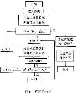確定了換熱管中心位置后,調(diào)用函數(shù)createFrustum()生成以換熱管中心為中心,以管板厚度為高的圓柱體。運(yùn)用布爾差運(yùn)算在管板實(shí)體中挖去每個(gè)圓柱體。其程序流程框架圖如圖6所示。