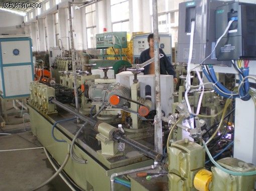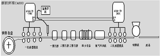 一、前言 不銹鋼管成型機械設備是將不銹鋼帶通過一次成型模具、氬弧焊接、三級打磨、粹火、二次成型、打碼、氣動切割等多道工序加工成為直徑大小不等的鋼管成品,產(chǎn)品廣泛應用在工業(yè)及裝飾行業(yè)。工業(yè)管具有耐腐蝕、耐高溫、耐高壓等特點。AC60變頻器主要應用在一次成型和二次成型這兩個環(huán)節(jié)上面。(7.5KW和4KW變頻器各一臺) 二、工藝流程說明(如圖一) 半成品不銹鋼帶整卷放置在放卷機架上面(被動放卷),在1#變頻器驅(qū)動下,鋼帶通過一次成型模具(多個模具)將鋼帶逐級卷成管狀,通過下一個環(huán)節(jié)—氬弧焊接設備對著閉合口進行連續(xù)不斷的焊接。然后進入三級加濕打磨將焊接點打磨光潔無痕。粹火使不銹鋼材質(zhì)變得更加適應各種惡劣場合。又通過第二次成型還可對成品直徑進行校正,保證產(chǎn)品的合格率。最后根據(jù)要求將不銹鋼管通過切割成不等長度的成品。 三、控制要求(只對變頻器控制作說明)見圖二 一次成型與二次成型要求保持同步。且2#變頻器要有微調(diào)。如若不能保持同步,那么在粹火這個環(huán)節(jié)(此時因材質(zhì)受熱變軟)很容易就會使管徑因拉長變細或堆疊,導致產(chǎn)品報廢??蛻粼瓉硎褂玫哪硰S家品牌的變頻器,采用外接三個電位器用模擬量控制,由于模擬量容易受到干擾產(chǎn)生衰減和漂移。出廢品率高,有時甚至無法使用。我們利用偉創(chuàng)AC60變頻器的485通訊及主輔通道疊加的強大功能,對該套設備進行改造后,效果極佳。 四、參數(shù)調(diào)試
