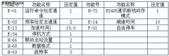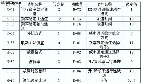 ![]() 2#變頻器參數(shù)設定(通過E-02設定手/自動切換) ![]() 注意事項: 一、2#變頻器出現(xiàn)故障時,給1#變頻器一個自由停車信號,實現(xiàn)緊急停車,減少出廢品率。反之,1#變頻器出現(xiàn)故障時,由于H-66設定為2,2#變頻器同樣也會緊急停車,兩者之間形成一個互鎖關(guān)系。 二、2#變頻器可根據(jù)實際中的機械減速比來設定同步比率(H-70)。管徑誤差校正可由微升/微降按紐做精準調(diào)節(jié)。 三、2#變頻器既可實現(xiàn)同步聯(lián)動,也可通過E-02=12改為外置電位器調(diào)節(jié)。(外接一個手/自動切換開關(guān)) |