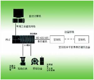 除空壓機(jī)設(shè)備外,還可以將與空壓機(jī)配套的冷凍式干燥器集成到RS422/485網(wǎng)絡(luò)中來(lái),實(shí)現(xiàn)空壓供氣設(shè)備的全面自控。