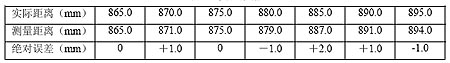 表1為常溫下在880±15mm 測(cè)量范圍的實(shí)驗(yàn)數(shù)據(jù)。經(jīng)過(guò)大量測(cè)試實(shí)驗(yàn),發(fā)現(xiàn)在測(cè)量范圍(本系統(tǒng)為100mm~1.4m)內(nèi)系統(tǒng)測(cè)量誤差小于±3mm,并且測(cè)量穩(wěn)定,重復(fù)精度高,受環(huán)境影響小。由此可見(jiàn)只須正確操作,排除人為使用不當(dāng)造成的誤差,系統(tǒng)的測(cè)試效果非常理想。