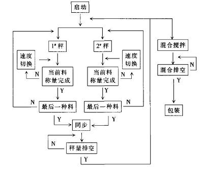 控制系統(tǒng)分手動和自動2種操作方式。在手動方式操作下,主要完成粉刷石膏砂漿生產(chǎn)線的單機調(diào)試、故障維修、稱量模塊的標定等功能。在自動方式下,上位機HMI實現(xiàn)粉刷石膏砂漿配方的設(shè)定、原料稱量瞬時值和累計報表動態(tài)顯示、生產(chǎn)線故障報警等功能。下位機PLC執(zhí)行粉刷石膏砂漿生產(chǎn)工藝配方值的工程轉(zhuǎn)換和精確實現(xiàn)每道工序的生產(chǎn)要求;變頻器高、中、低速切換,去皮和零位追蹤,超差處理,故障診斷等功能。同時,由于在程序中加入了對生產(chǎn)狀況的預測控制和累計誤差補償?shù)人惴ǎ沟梅鬯⑹嗌皾{的生產(chǎn)控制精度和穩(wěn)定性大大提高。SIWAREX系統(tǒng)在粉刷石膏砂漿生產(chǎn)中的工藝控制過程如圖1所示。
