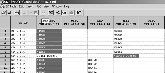 在項(xiàng)目的實(shí)施中由于傳動(dòng)PLC之間采用MPI通訊,筆者在第一次項(xiàng)目實(shí)施中采用SIEMENS STEP7的程序庫(kù)自帶的程序塊進(jìn)行通訊。但在使用中發(fā)現(xiàn)利用程序塊的方式并不穩(wěn)定,每次在硬件配置后都會(huì)出現(xiàn)不明原因的中斷。由于項(xiàng)目實(shí)施周期短,根本沒有時(shí)間進(jìn)行原因的查找,故障診斷分析。由于西門子提供了全局變量的通訊方式,并且其硬件方式也是利用MPI網(wǎng)絡(luò)。筆者拋棄第一種方案,最終采用全局變量進(jìn)行傳動(dòng)PLC間的通訊。事實(shí)證明這種方案簡(jiǎn)單易行且相當(dāng)可靠。全局變量的通訊方式更多依賴于硬件配置,不需單獨(dú)編程,對(duì)于通訊的變量可直接引用,并且全局變量的硬件配置的下載可以在線進(jìn)行,PLC不需重啟。