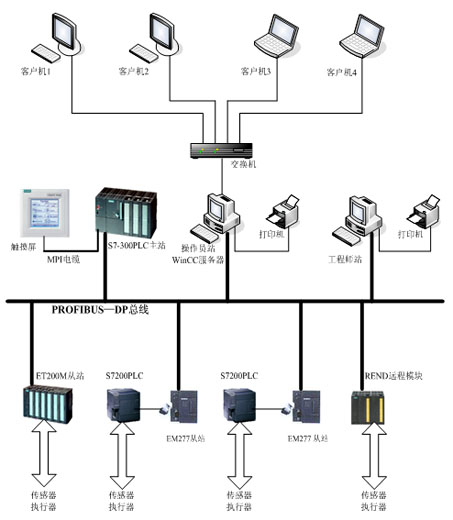 從站的形式多種多樣, ET200M從站IM-153帶模擬量輸入輸出模塊; 從站S7-200PLC CPU224通過(guò)EM277 DP接口與總線相連,S7-200PLC可運(yùn)行自身程序,連接I/O輸入輸出,又可與S7-300PLC交換信息;智能儀表、智能模塊直接掛在總線上,它們的CPU與PLC的CPU并行工作,占用主機(jī)的時(shí)間很少,有利于提高PLC的掃描速度和完成特殊功能。當(dāng)然也可以連接其它的更多的從站。