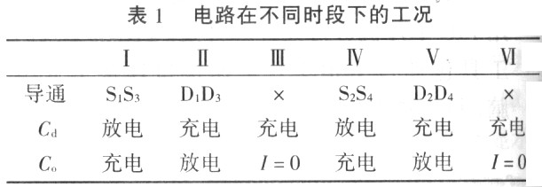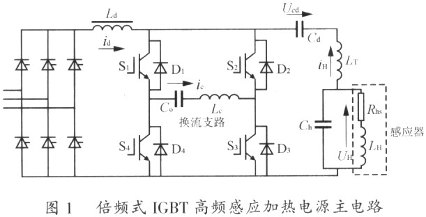 倍頻式ICBT高頻感應加熱電源主電路如圖1所示。電路在穩(wěn)態(tài)下,通過S1~S4和D1~D4的輪流導通,換流支路和隔直電容之間進行充放電,產(chǎn)生的振蕩電流流經(jīng)負載交流等效電阻RH,構(gòu)成負載電流的正負半波。