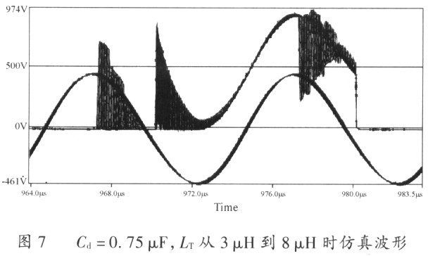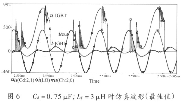 圖6是LT/Cd=4,Cd=0.75μF,LT=3μH時的仿真波形,通過與圖4和圖5的對比可以看出,此時參數(shù)選擇最為合適。