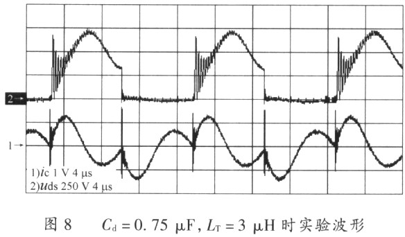 結(jié)合前面的分析,做了相關(guān)的實驗,其波形如圖8所示。該實驗中IGBT的工作頻率是50kHz,負載輸出頻率為100kHz。