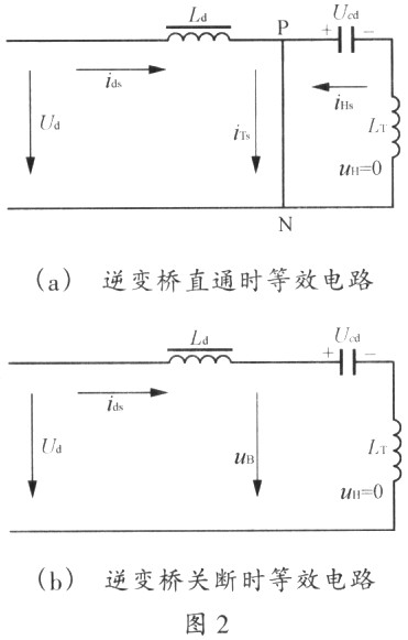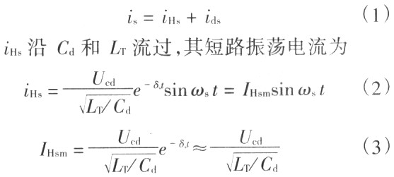 在負載短路時,逆變橋囚侵入干擾信號而產(chǎn)生直通短路,逆變橋輸入電壓突降為零。這時,原來儲藏在濾波電感Ld中的磁能和隔直電容Cd中的電能均分別以短路電流ids和iHs的形式向逆變電路釋放,等效電路圖為圖2(a)所示。橋中IGBT流過的短路電流is為