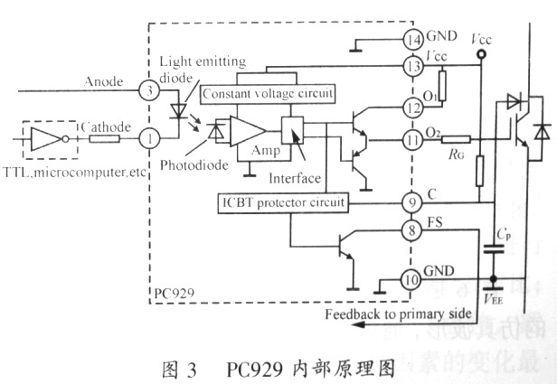 所謂降柵壓慢關(guān)斷技術(shù)指的是,當IGBT出現(xiàn)過流時,先將其柵極驅(qū)動電壓降低,然后將其關(guān)斷,一是延長了IGBT能夠承受過流的時間,二是可以降低器件受到過流沖擊的幅度。過流時器件通態(tài)壓降升高,管子瞬時熱損耗急劇增加,為防止器件熱損壞,過流時間應足夠短,一般<10μs。SHARP公司的光耦合器PC929將這一功能和驅(qū)動電路集成在一起,器件內(nèi)部原理圖如圖3所示。