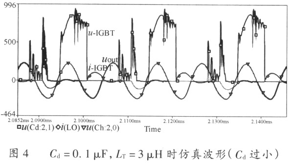 從減小短路電流的角度看,Cd要盡可能小,LT要盡可能大。但Cd過小,電路工作時存在以下缺點:隔直效果不理想;輸出電壓正弦失真度過高,輸出電壓降低,加熱效果不理想;反并二極管重新導通,增加二極管的電流容量,如圖4所示。