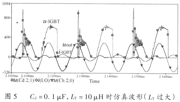 當LT過大時,電路工作時存在以下缺點:LT上的高頻壓降過高,使得輸出電壓降低;管子關(guān)斷時承受的正向阻斷電壓升高;內(nèi)槽路諧振頻率減小,IGBT和二極管出現(xiàn)二次導通,如圖5所示。