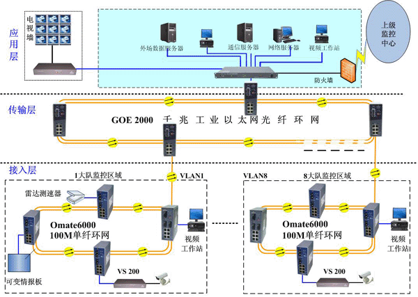 骨干傳輸網(wǎng)采用千兆工業(yè)以太網(wǎng)交換機構(gòu)建,各個大隊之間占用4芯光纜,組成千兆自愈環(huán)網(wǎng)。如在某處發(fā)生光纖、設(shè)備故障時,可在30ms之內(nèi)完成網(wǎng)絡(luò)重構(gòu),最大限度保證了業(yè)務(wù)的可靠性。同時高達1.25G的網(wǎng)絡(luò)帶寬及完善的網(wǎng)絡(luò)策略,可以保證系統(tǒng)有充足的業(yè)務(wù)傳輸保障。