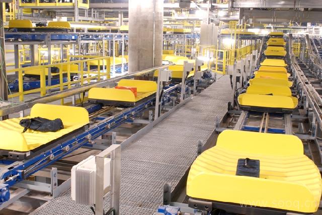 在結(jié)構(gòu)上,BHS由30 km皮帶輸送系統(tǒng)和38 km高速托盤系統(tǒng)組成,Jeff先生帶領的西門子團隊還大膽的采用了雙層系統(tǒng),一下便將總?cè)萘考颖?,但是這個舉措需要更多的天花板空間。在西門子團隊的努力和爭取下,航站樓地下室贏得了珍貴的五米增高。航站樓運營后,由于有了BHS系統(tǒng)這個超高速運轉(zhuǎn)大腦的支持,航空公司只要將行李運到分揀口,系統(tǒng)只需要4.5分鐘就可以將這些行李傳送到行李提取轉(zhuǎn)盤,大大減少旅客等待提取行李的時間。其中早交行李存儲系統(tǒng)的處理能力達到3,000件,幾乎是一個中型機場的高峰小時行李數(shù)量,徹底的改善了目前航空公司對辦票時間的限制。