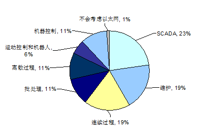 以太網(wǎng)具有多種層面的應(yīng)用,23%的用戶將其作為SCADA的首選,19%將以太網(wǎng)應(yīng)用在維護(hù)和連續(xù)過程。批處理,離散和機(jī)器控制并列第三位(11%),運動控制和機(jī)器人名列第四位(6%)。不過,仍有1%的用戶表示不希望使用以太網(wǎng)。