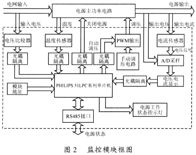 隨著電力電子技術(shù)的快速發(fā)展,開關(guān)電源越來越受到重視,尤其是在通信、電力領(lǐng)域中得到了廣泛應(yīng)用。近年來,為了提高電源使用的方便性和簡易性,電源的模塊化和集成化成為研究的重要課題。電源采用模塊化設(shè)計(jì)使得不同的系統(tǒng)可以根據(jù)自身的容量來選擇并聯(lián)模塊的數(shù)量,同時(shí)又保證了冗余度,便于維護(hù)和替換,實(shí)現(xiàn)丁“積木式”結(jié)構(gòu),而針對這種新的系統(tǒng)結(jié)構(gòu),舊的電源監(jiān)控維護(hù)方式已無法滿足管理要求,因此,有必要采用“積木式”多重監(jiān)控系統(tǒng)。目前,一些文獻(xiàn)介紹了這種電源監(jiān)控方式,但是,監(jiān)控模塊沒有考慮到成本、體積等因素,而在將電源主功率和其他外圍電路集成時(shí),這些因素是不得不考慮的。為了便于將監(jiān)控模塊與主功率模塊集成在一起,實(shí)現(xiàn)小型化,保證可靠性,必須設(shè)計(jì)出結(jié)構(gòu)簡單、功能強(qiáng)大、抗干擾能力強(qiáng)、成本低廉、便于大規(guī)模生產(chǎn)的監(jiān)控模塊。