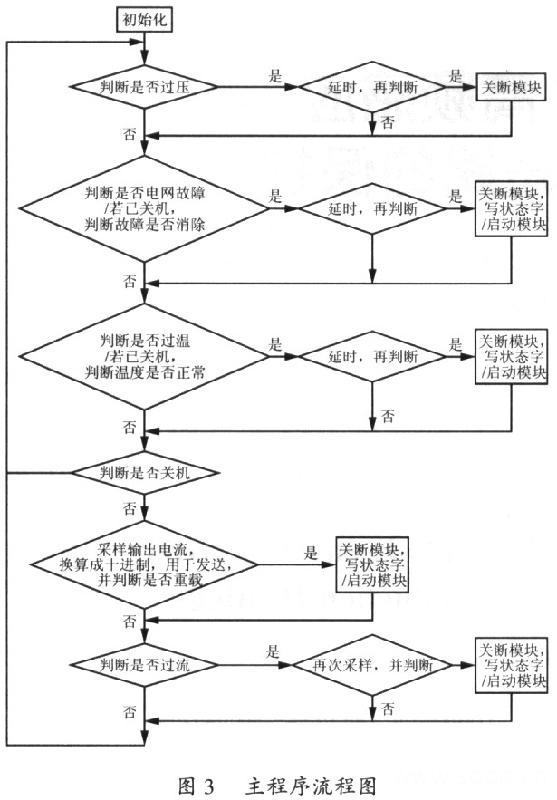 主程序的流程圖如圖3所示,初始化后進(jìn)入主循環(huán),檢測系統(tǒng)的狀態(tài),判斷是否過壓,電網(wǎng)是否故障,是否過溫,是否過流,并且采樣輸出電流,轉(zhuǎn)換成電壓信號作為顯示并且通過通信總線輸送到上位機(jī)。由于模塊的電壓、電流顯示只是起到監(jiān)視作用,不作為測量,因此刷新的頻率不需要很高,基本上不加重MCU的負(fù)擔(dān)。