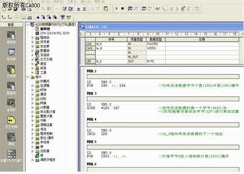 起始位 即幀頭以至少3.5個(gè)字節(jié)的傳輸時(shí)間停頓間隔作為開始.依次傳輸一幀數(shù)據(jù)直至結(jié)束 Bit1 從機(jī)地址 變頻器為從機(jī),變頻器的本機(jī)地址即為PLC通訊的從機(jī)地址,由變頻器的參數(shù)設(shè)定(H-67) Bit2 命令代碼 主機(jī)發(fā)送的命令代碼,對(duì)從機(jī)進(jìn)行相應(yīng)的操作,如03H讀從機(jī)參數(shù)、06H寫從機(jī)參數(shù)、08H回路自檢測(cè)。 Bit3 / Bit4 數(shù)據(jù)地址高位/低位 即從機(jī)數(shù)據(jù)地址 Bit5 / Bit6 數(shù)據(jù)地址高位/低位 即從機(jī)數(shù)據(jù)地址里面的內(nèi)容 Bit5 / Bit6 CRC校驗(yàn)低位/高位 采用西門子S7-200PLC編程如下: 1、CRC校驗(yàn)子程序編寫 首先將編程端口PORT0(PORT1)通過對(duì)SMB30(SMB130)設(shè)置,即偶校驗(yàn)(E、8、1)和波特率的值的內(nèi)容。對(duì)PLC進(jìn)行初始化。并編寫CRC校驗(yàn)子程序。收此時(shí)的編程端口無(wú)法進(jìn)行狀態(tài)監(jiān)控。子程序使用了多個(gè)局部變量,以方便其它子程序調(diào)用。 在西門子STEn 編程環(huán)境下(如圖1) 設(shè)置變頻器以下參數(shù):H-66=0//變頻器設(shè)為從站 2、速度鏈子程序 按照我們上面所述的比例關(guān)系式來設(shè)計(jì)子程序。利用浮點(diǎn)運(yùn)算處理,調(diào)節(jié)比例系數(shù)時(shí)可達(dá)到變頻器的最大分辯率,即0.01HZ。 3、RS發(fā)送格式子程序 以每隔30MS發(fā)送一幀數(shù)據(jù),不斷循環(huán)發(fā)送。經(jīng)實(shí)踐證明效果很好。 4、其它 注意單位時(shí)間內(nèi)的升降值(分辯率)的限幅,主機(jī)升降速度和從機(jī)升降速度一定要分為兩個(gè)定時(shí)器編寫。 5、見上圖所示,在輸入點(diǎn)采用了組合方式輸入,節(jié)約了大量的輸入點(diǎn),有效的降低了成本。 七、結(jié)束語(yǔ) 采用PLC同變頻器通訊,很容易實(shí)現(xiàn)多變頻器之間的同步和比例聯(lián)動(dòng)運(yùn)行。該系統(tǒng)具有成本低、信號(hào)精度高(可達(dá)變頻器最高分辨率)、傳輸距離遠(yuǎn)、抗干擾性強(qiáng)等特點(diǎn)。我們以這種方式做了幾十套控制系統(tǒng),用戶反映非常好。具有接線簡(jiǎn)單,控制精度高,成本低等特點(diǎn),特別適合對(duì)多臺(tái)變頻器的同步、比例聯(lián)動(dòng)以及對(duì)變頻器頻率精度要求比較高的場(chǎng)合。 | |||||||||||