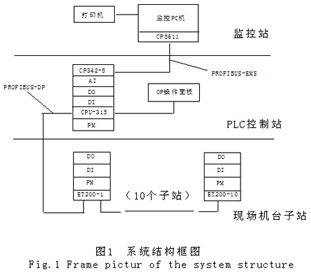 根據(jù)現(xiàn)場(chǎng)條件和設(shè)計(jì)思想,整個(gè)系統(tǒng)分監(jiān)控管理層和現(xiàn)場(chǎng)測(cè)控層,如圖1系統(tǒng)結(jié)構(gòu)框圖所示。監(jiān)控管理層由1臺(tái)PC機(jī)承擔(dān),現(xiàn)場(chǎng)測(cè)控層由PLC主站和現(xiàn)場(chǎng)機(jī)臺(tái)從站組成。各層通過PROFIBUS工業(yè)現(xiàn)場(chǎng)總線連接。