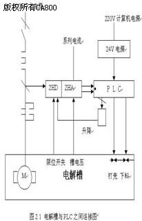 該控制系統(tǒng)采用DDC(直接數(shù)字控制)、SCC(過(guò)程監(jiān)控)兩級(jí)分布式控制方案,原理圖見(jiàn)圖1.1。每臺(tái)槽控箱控制1臺(tái)電解槽,同時(shí)每臺(tái)槽控箱都有獨(dú)立的PLC作為主控制器,負(fù)責(zé)對(duì)系列電流、槽電壓和各種開(kāi)關(guān)量輸入信號(hào)的采集,數(shù)據(jù)解析,模糊推理,判斷槽中氧化鋁濃度,并通過(guò)調(diào)節(jié)下料時(shí)間間隔以及極距,達(dá)到電解槽內(nèi)物料平衡和熱量平衡。