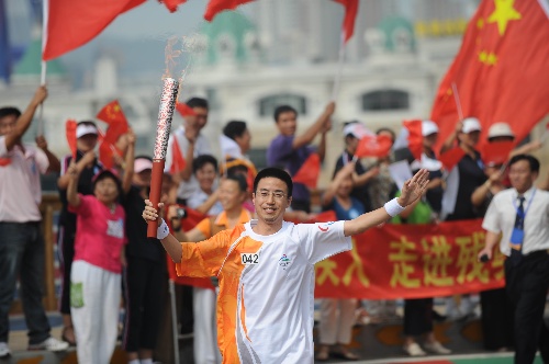 9月3日,2008殘奧會火炬?zhèn)鬟f大連站的火炬接力現(xiàn)場, 歐姆龍工貿(mào)(大連)有限公司員工徐永臣榮幸的成為第42棒火炬手。