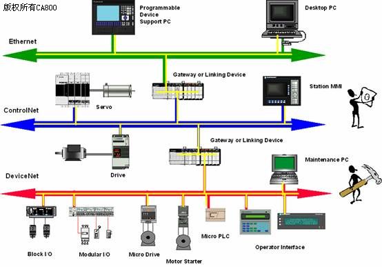 根據控制要求不同,在一個現代化工廠中總會有多種總線網絡并存,網絡之間的互連,信息的傳輸, 如何實現無縫連接是關鍵。羅克韋爾自動化采用的開放標準工業(yè)以太網(EtherNet/IP),控制網(ControlNet)及設備網(DeviceNet)都是使用了同一種應用層協議(CIP),使得網絡之間的傳遞數據無需編程,真正實現了無縫連接(如圖四)。隨著工業(yè)以太網(EtherNet/IP)的穩(wěn)步發(fā)展,在通訊效率、安全、同步,和多媒體數據傳輸等各個方面取得了實質的進步。使得在控制層、設備層使用工業(yè)以太網(EtherNet/IP)成為現實。羅克韋爾自動化和思科合作開發(fā)的企業(yè)網絡參考架構(Reference Architecture), 合作品牌Stratix 8000工業(yè)交換機等產品使得企業(yè)從信息系統(tǒng),集成架構PAC控制平臺到設備層執(zhí)行機構實現了無縫的連接, 構成一個完整的企業(yè)信息化生產控制和執(zhí)行系統(tǒng)。
