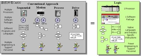 現代制造工廠中很少只是進行單一的控制,通常是由邏輯控制,過程控制,運動控制,傳動控制,安全控制,批次處理等控制過程中的兩種或者多種控制的集合。過去這種多應用的工廠需要多種控制器來支持,PLC做邏輯控制、伺服控制器做運動控制、DCS做過程控制等等。這就意味著整個自動化工廠需要很多種系統(tǒng)來完成,他們可能是完全獨立的, 系統(tǒng)間通訊連鎖需要很多時間和工作量,還要很多的時間來編寫不同的接口程序,更多的培訓,更多的維護工程師,更多的備品備件?,F在以羅克韋爾自動化PAC為代表的PAC可以將上述所有的控制功能整合在一個控制平臺上(如圖三),這會給制造廠商帶來巨大的價值,通過可重用性的編程方式使項目實施更加迅捷,減少了額外的硬件,額外的接口程序,減少了維修維護成本,減少了備品備件。而在使用方面, PAC的編程環(huán)境在同類產品中獨樹一幟, 一個統(tǒng)一的編程環(huán)境能夠對這幾種控制同時進行編程和組態(tài), 這才真正實現了一個平臺多種控制的目的。 真正實現了不同控制之間的通透協調。 羅克韋爾自動化RSLogix 5000中的運動控制指令, 過程控制指令和批次控制指令等都是一個真正PAC所必須具備的基本特點。 此外, PAC所具備的標簽編程, 標簽全局調用是羅克韋爾自動化專有的領先優(yōu)勢, 這進一步從軟件方面集成了人機界面和變頻器, 成為市場上控制種類最靈活, 集成度最高的PAC.