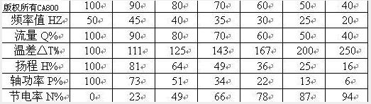 對于水泵來說,流量Q與轉(zhuǎn)速N成正比,循環(huán)水溫度△T與轉(zhuǎn)速成反比,揚程H與轉(zhuǎn)速N的二次方成正比,而軸功率與轉(zhuǎn)速N的三次方成正比,見下表: