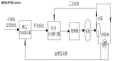 考濾到大中型中央空調(diào)循環(huán)水系統(tǒng)中溫度與水壓對冷凍水、冷卻水帶走熱量的影響,因此本系統(tǒng)采用溫度與水壓為變量雙閉環(huán)控制。