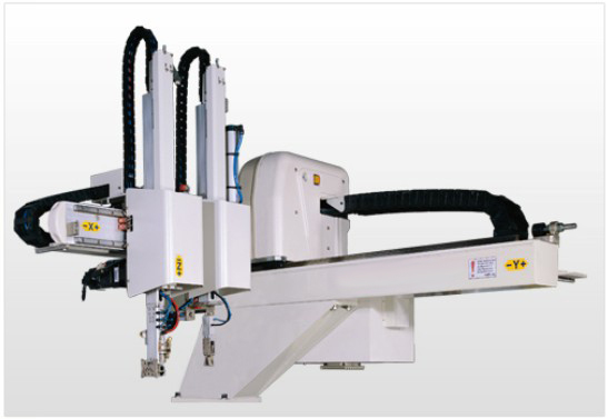 成型機專用機械手在市場上按照驅(qū)動類型主要分為兩種類型:一種是氣動元件驅(qū)動比較單純的作低速點對點的運動控制的低端的機械手;另一種就是需要采用高性能伺服系統(tǒng)作為驅(qū)動元件的高速精確定位高性能機械手。本文論述的是第二種機電伺服控制機械手,機械手基于臺達(dá)伺服系統(tǒng)技術(shù)。伺服系統(tǒng)在機械手上的應(yīng)用有很多與一般伺服應(yīng)用場合的不同之處,比較客戶使用的是某日系系列伺服系統(tǒng),臺達(dá)伺服通過合理的設(shè)計能夠達(dá)到更高的性能指標(biāo),同時又能降低客戶的成本,提高其產(chǎn)品的性價比。