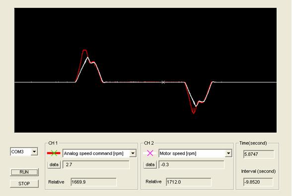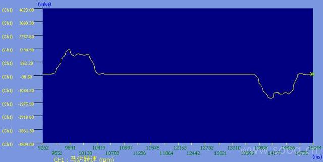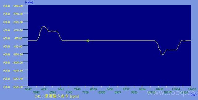 圖3、圖4兩條曲線是由ASD-A伺服調(diào)試軟件抓取得實時曲線,在這樣的運行情況,伺服的運行并不平穩(wěn),伺服的運行情況是,在加速時電機會出現(xiàn)高速加速,伺服以1600rpm速度運行,在運行到中間時伺服會出現(xiàn)一個明顯加速過程,伺服的運行速度在1000rpm左右,這樣的運行情況是無法滿足客戶的要求的。