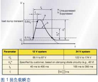 幾乎所有直接連接至汽車電池的電子組件和電路都要求保護,以免于受到抑制、瞬態(tài)電壓(高達60V)和反向電壓狀態(tài)的損害。對于這些電子電路而言,必須能夠經(jīng)受住電源線路上一定程度的過電壓,這也是種常見的要求。對于那些要求任何特殊車載電子系統(tǒng)的主電源輸入均能夠在各種不同瞬態(tài)電壓狀態(tài)(包括交流發(fā)電機拋負載)下工作的車載系統(tǒng)來說尤為如此。