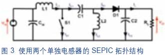 SEPIC 轉換器提供了一種降壓轉換,直到輸入電壓等于或者降到輸出電壓電平之下。然后,其將提供升壓轉換,直到電池電壓降至最小容許輸入電壓的電平。使用 SEPIC 的一個主要弊端是,它需要一個單耦合電感器(變壓器)或者兩個單獨電感器,以及一個耦合電容器,如圖 3 所示。