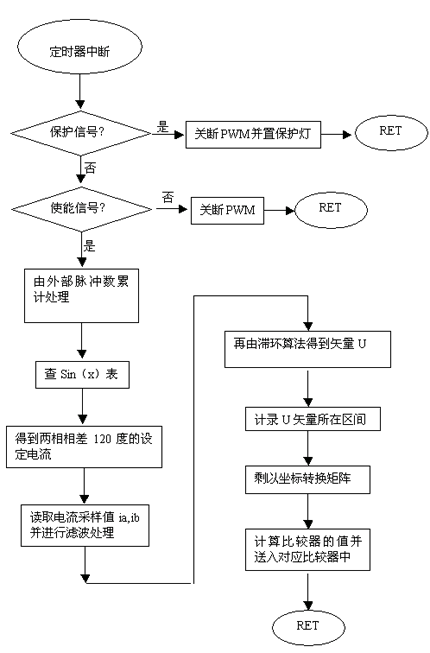 三相混合式步進(jìn)電機(jī)一般把三相繞組連接成星形或者三角形,按照電路基本定理,三相電流之和為零。即IU+IV+IW =0 。所以通常只需產(chǎn)生兩相繞組的給定信號(hào),第三相繞組的給定信號(hào)可由其它兩相求得。同樣,只需要對(duì)相應(yīng)兩相繞組的實(shí)際電流進(jìn)行采樣,第三相繞組的實(shí)際電流可根據(jù)式求得。