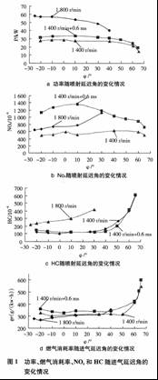 本實驗分別在1400r/min和1800r/min,調(diào)節(jié)噴射延遲角,測量發(fā)動機的功率、燃氣消耗率,NOx和HC,結果如圖1所示。