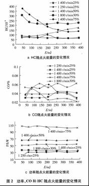 3.在大負荷或高速工況下,點火能量較小時HC排放會上升。