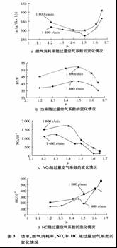 1.稀燃對于發(fā)動機經(jīng)濟性和動力性有明顯影響。當過量空氣系數(shù)為1.5時,燃料消耗量最低,發(fā)動機輸出功率最大。