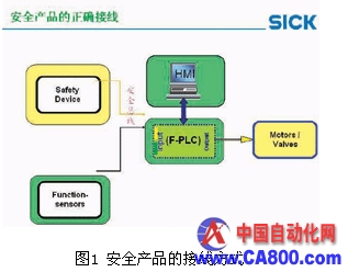 以汽車生產(chǎn)廠為例,尤其是在自動化程度較高的焊裝車間和總裝車間,大量的焊接機器人和裝配機械手的出現(xiàn),造成了許多需要安全保護的危險區(qū)域,所以安全傳感器,如區(qū)域保護掃描器、安全光幕、安全鎖、安全地毯、急停開關(guān)等的使用已經(jīng)非常普遍,但現(xiàn)在連接這些安全設(shè)備的控制系統(tǒng)仍停留在“安全繼電器”或“安全PLC”的非總線控制系統(tǒng)的低級控制狀態(tài),大大限制了生產(chǎn)過程控制系統(tǒng)的發(fā)展。但如果將這些安全設(shè)備連接到非安全的現(xiàn)場總線系統(tǒng)(如標準的Profibus、DeviceNet等總線系統(tǒng))上去,就會存在比較大的安全隱患,是一種非安全的控制狀態(tài)。圖1所示的是安全產(chǎn)品的接線方式。