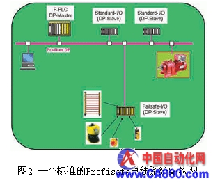 基于這種狀況,世界上幾家比較大的自動化系統(tǒng)公司(如Siemens、Rockwell等)聯(lián)合了幾家著名的安全傳感器的生產(chǎn)公司(如SICK、OMRON),共同合作開發(fā)了開放性的、相互兼容的安全總線系統(tǒng),如AS-Interface safety、 Profisafe、 DeviceNet Safety、 interbus safety及Safety bus p等。這些安全總線控制系統(tǒng)大大加快了控制系統(tǒng)前進的步伐。圖2 為一個標準的Profisafe總線系統(tǒng)結(jié)構(gòu)圖。