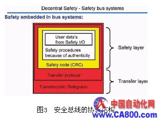 安全總線系統(tǒng)和標準總線系統(tǒng)的主要區(qū)別在于通信協(xié)議的標準不同。安全總線系統(tǒng)的安全是對標準協(xié)議的擴展,使得標準及安全裝置可在同一個網(wǎng)絡(luò)上運行。其獨特之處就在于安全通信的實現(xiàn)無需諸如網(wǎng)關(guān)、網(wǎng)橋等昂貴的硬件設(shè)備,僅僅通過軟件層就可實現(xiàn)。圖3所示為安全總線的協(xié)議結(jié)構(gòu)。