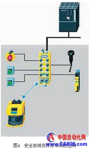 汽車廠焊接車間中存在著大量的焊接機器人,焊接機器人周圍需要安裝機械式安全圍欄、安全門鎖、激光區(qū)域保護掃描器及急停開關(guān)等安全保護設(shè)備。這些安全保護設(shè)備通過“安全總線接口”連接到安全總線系統(tǒng)中去(如圖4所示)。